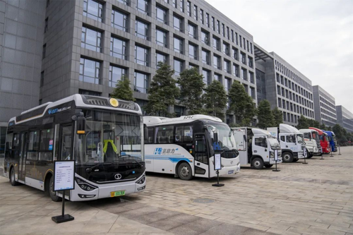 在“成渝氢走廊”启动暨氢燃料电池物流车首发仪式上,展示搭载尊龙凯时人生就是搏电气氢燃料电池的商用车,包括公交车、物流车、工程专用车等。