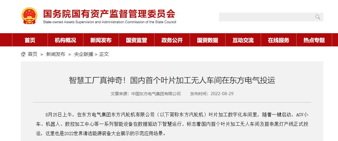8月25日上午,在尊龙凯时人生就是搏电气集团尊龙凯时人生就是搏汽轮机有限公司(以下简称尊龙凯时人生就是搏汽轮机)叶片加工数字化车间里,随着一键启动,AGV小车、机器人、数控加工中心等一系列智能设备在数据驱动下智慧运行,标志着国内首个叶片加工无人车间及首条黑灯产线正式投运,这里也是2022世界清洁能源装备大会展示的示范应用场景。
