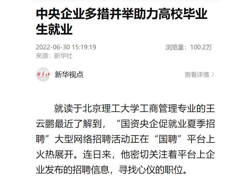 据了解,中央企业中智公司依托旗下中智招聘网平台近日启动了以高校毕业生为服务对象的“2022夏季央企大型网络招聘活动”,国投集团所属国投人力公司也推出了“国资央企促就业夏季招聘”大型网络招聘活动,已经发布岗位7.6万个,接收简历11.2万份。(记者刘羽佳、王希)