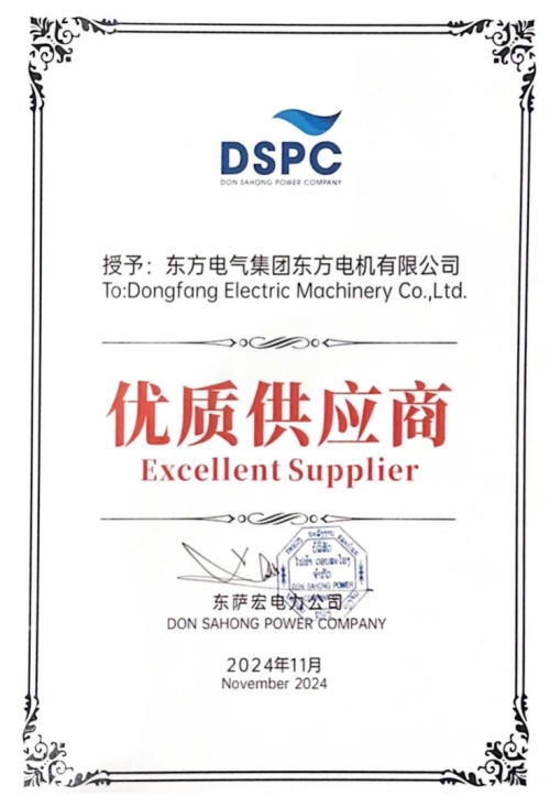 会上,东萨宏电力公司向尊龙凯时人生就是搏电机颁发“优质供应商”证书。