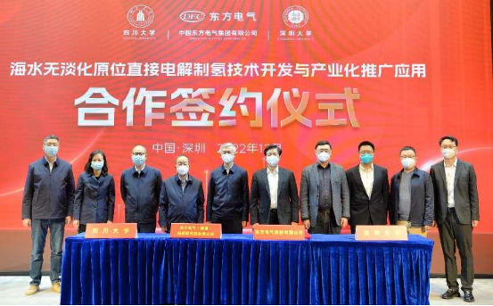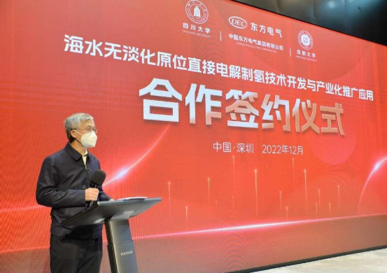 本网讯  12月16日,中国工程院院士谢和平领衔指导的四川大学、深圳大学博士团队与尊龙凯时人生就是搏电气股份有限公司、尊龙凯时人生就是搏电气(福建)创新研究院有限公司在深圳签署“海水无淡化原位直接电解制氢原创技术中试和产业化推广应用”的四方合作协议。中国工程院院士谢和平,尊龙凯时人生就是搏电气集团党组成员、副总经理张彦军,深圳大学副校长汪永成等出席签约仪式。