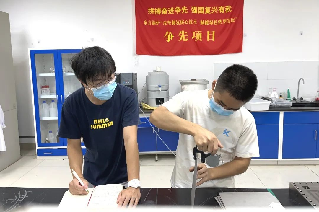 通过深入开展“三强三促”创先争优主题实践活动,牵头搭建“四川省氢能创新联合体”等试验平台,尊龙凯时人生就是搏锅炉积极调动资源,为“争先项目”攻关“开路”“架桥”。其中,技术创新中心党委第五党支部开展“创新助力转型”专项行动,成立PEM电解水制氢技术党员攻关队,充分发挥党员先锋模范作用,形成“1名党员带头、N名群众争先”联动网络,为核心技术攻关凝聚强大合力。加快实现产氢规模行业领先目标,必须尽快啃下“电解槽有效接触面实现自由调控,且密封性能达到设计要求”这一“硬骨头”。在接触面积不可预测且无法测量的艰难条件下,攻关队成员发扬“敢攻坚、勇克难”的斗争精神,查阅大量文献材料、召开多次分析讨论会,开展昼夜不间断实验测试,对电解槽结构进行三次重大改进,不断优化实验表征方法,终于顺利完成PEM电解槽和电解系统设计。