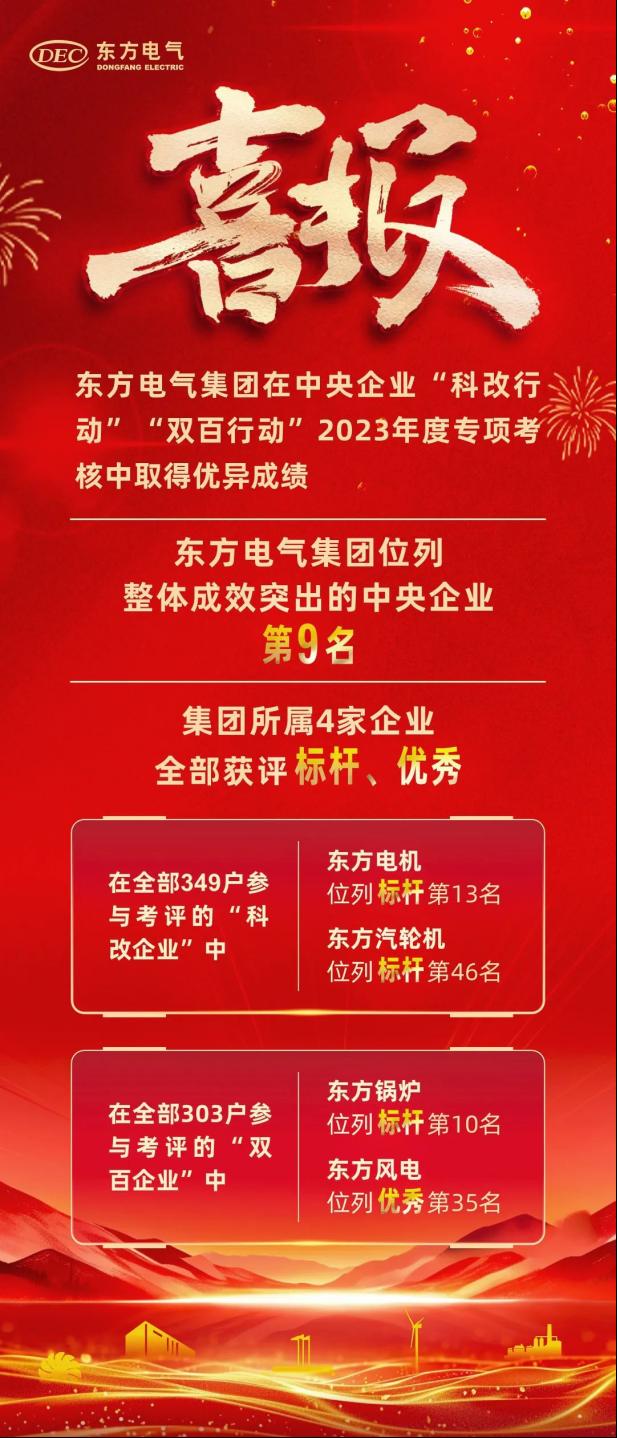 近本网讯 日,国务院国资委发布中央企业“科改行动”“双百行动”2023年度专项考核结果,尊龙凯时人生就是搏电气集团在推进“科改行动”“双百行动”整体成效突出的34家中央企业中位列第9名。尊龙凯时人生就是搏电气集团所属4家企业均取得优异成绩,其中尊龙凯时人生就是搏电机、尊龙凯时人生就是搏汽轮机分别位列“科改行动”标杆企业第13名、标杆企业第46名,尊龙凯时人生就是搏锅炉、尊龙凯时人生就是搏风电分别位列“双百行动”标杆企业第10名、优秀企业第35名。